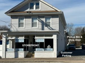 For customer pickups, please go to our shop door. That’s the grey door on the right/North side of the building. You can enter the driveway between Artist-Tees and Bobs Carpet. If you are picking something up and we aren’t there, look in the bin to the right of the door. We put small paid-in-full orders there for 24 hours pickup. Please call ahead to pick up larger orders that won’t fit in the bin.